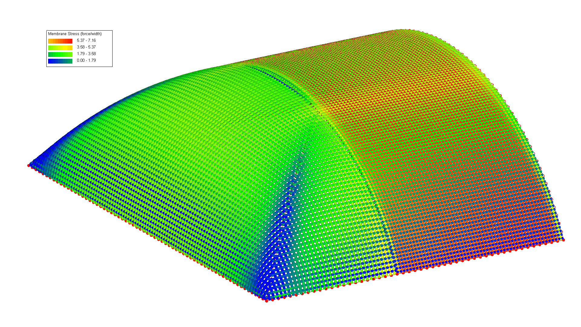 In Easy.Vol the internal pressure is changing its direction and size depending on the loaded area. Therefore a precise model is described by Easy.Vol, where the consideration of gas-laws enables the realistic behavior of the internal pressure: only in this case the membrane stresses get the correct size.