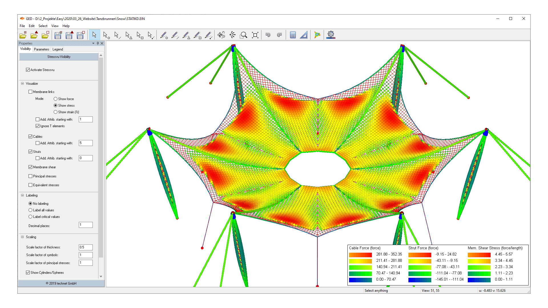 Additionally, given the large amount of data required to model all lightweight structure models, the graphical representation of the deformation, force and stress results must be able to be easily controlled to highlight the relevant data. The right picture shows a membrane structure with 63 partial areas and an extension of 360m x 150m.