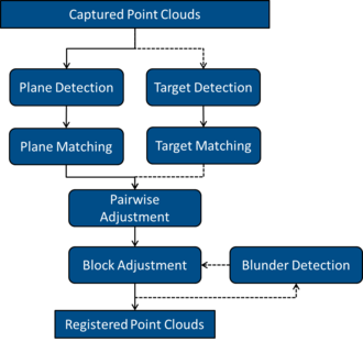4. Block adjustment of all scans into a common target system, either