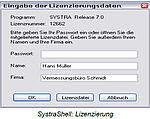 Bei erstmaligem Aufruf von SystraShell ist das gesamte System über ein zentrales Lizenzpasswort freizuschalten. Dazu erscheint die Maske "Eingabe der Lizenzierungsdaten", in der man die separat gelieferte Lizenzdatei angibt.