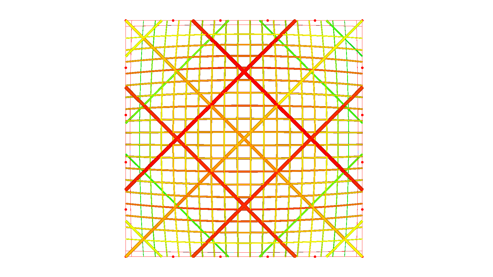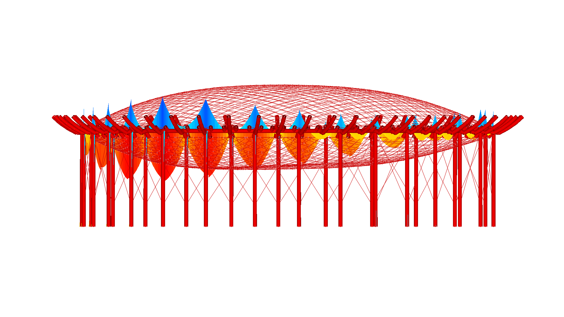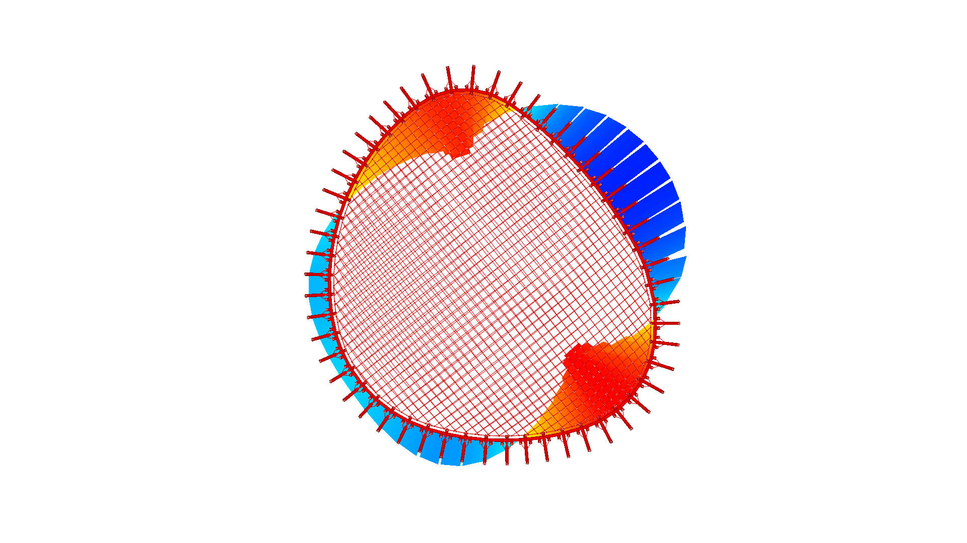 Die pneumatisch gespannte Membranfläche ist normalerweise an einer biegesteifen Primärstruktur befestigt. Die allgemeine Interaktion zwischen der pneumatisch beanspruchte Membran und die Primärstruktur wird in Easy durch ein Hybridmodell berücksichtigt. Die Nichtbeachtung der Interaktion führt zu "falschen" Ergebnissen.