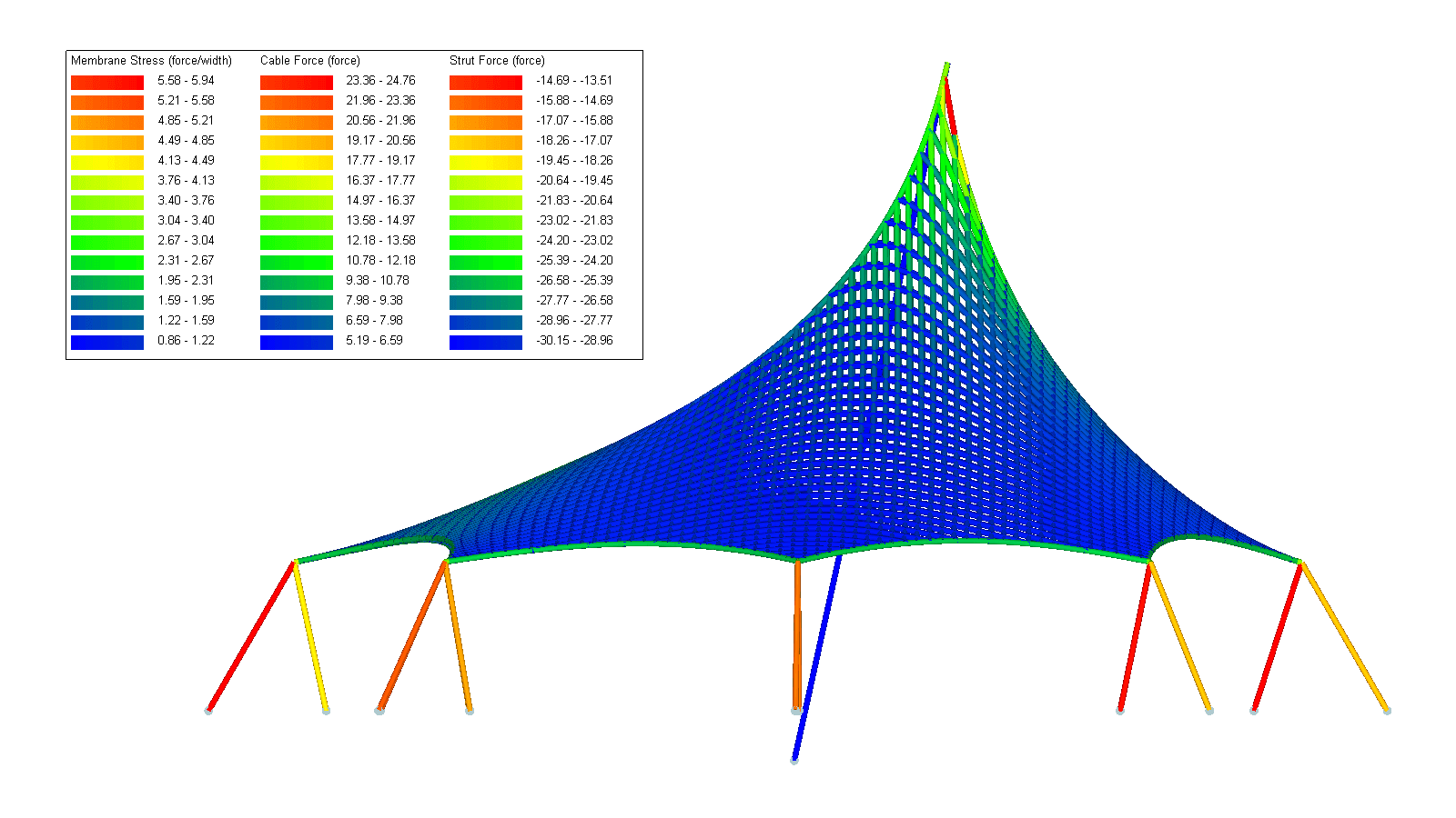 Die Auswertung der Formfindungsergebnisse wird durch Easy.Form garantiert. Die Software bietet Tools zur Visualisierung der Kraft- und Spannungsverteilungen sowie Höhenlinien und Falllinien zur Entwässerungsanalyse.