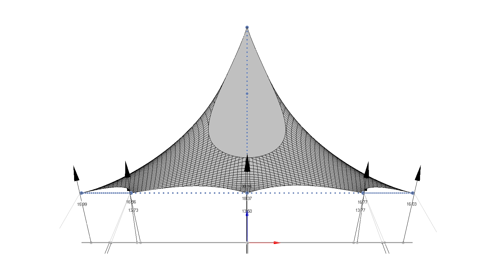 Während des Formfindungsprozesses sind jederzeit alle Berechnungsschritte visualisierbar. Die Kraftdichtemethode gewährleistet eine lineare Berechnung ohne Näherungswerte. Unsere Algorithmen sind optimiert und garantieren, selbst bei sehr großen Strukturen, eine schnelle Berechnung.