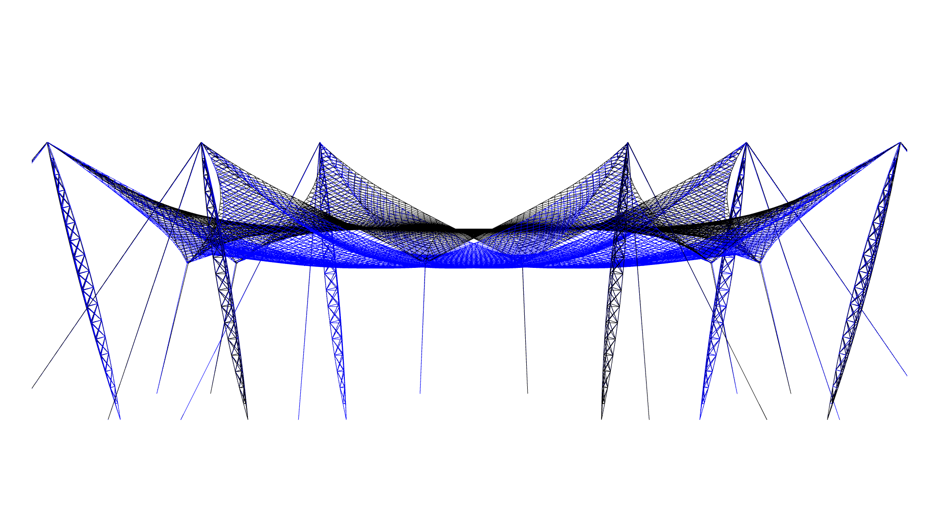 Zusätzlich muss aus der großen Menge der Daten, die für die Modellierung von leichten Flächentragwerken im Rechner nötig sind, eine leicht kontrollierbare grafische Anzeige der Deformations-, Kraft- und Spannungsergebnisse möglich sein, damit auf die entscheidenden Ergebnisse hingewiesen werden kann. Das rechte Bild zeigt eine Membranstruktur mit 63 Teilflächen und einer Ausdehnung von 360m x 150m.