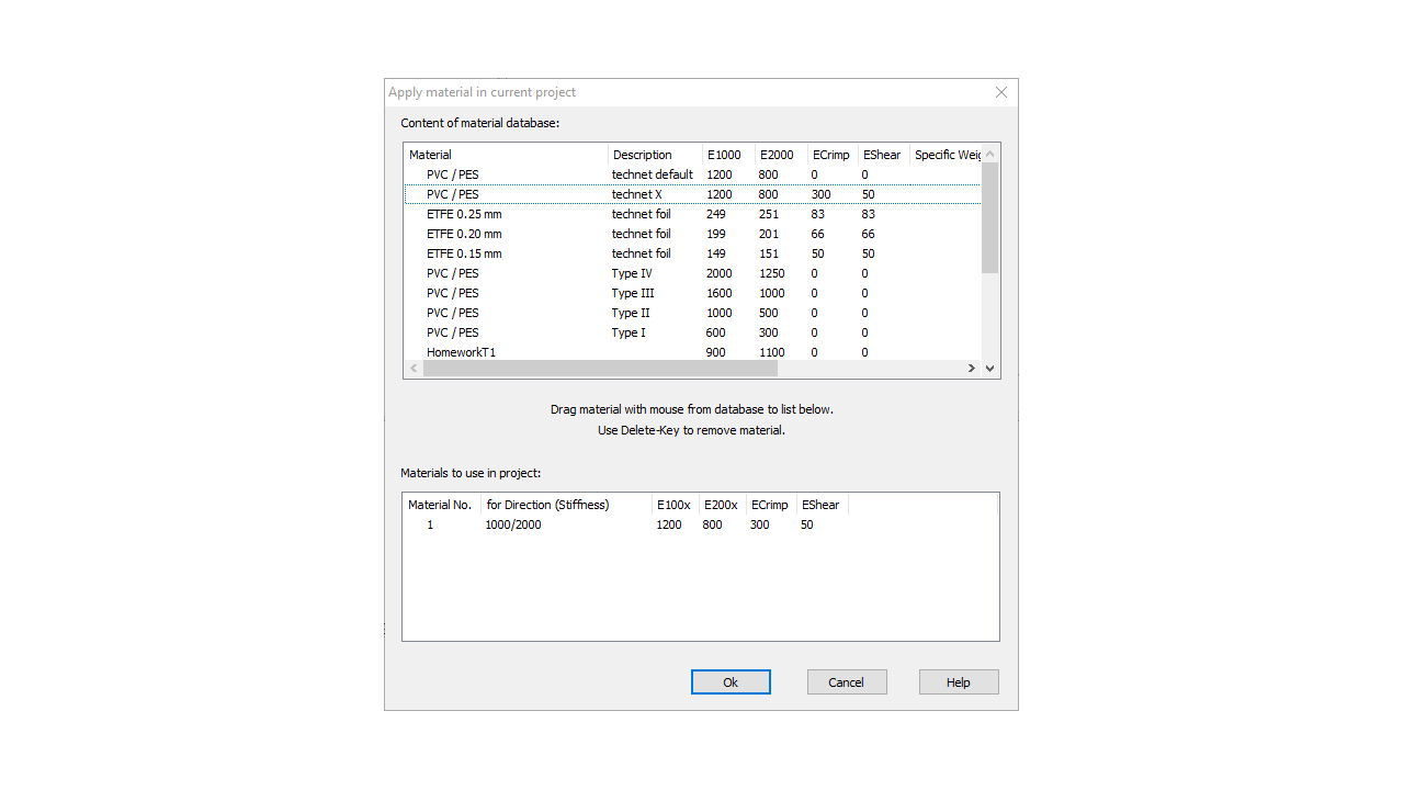 Easy unterstützt exakte Materialgesetze mit finiten Membrandreieckselementen mit Kett-/Schusssteifigkeiten unter Beachtung von Querdehnung und Schubsteifigkeit (z.B. für Folien). Ausserdem kann eine vereinfachte Materialbeschreibung bei orthotropen Geweben mit nichtlinearem Materialverhalten durch Kett-/Schusssteifigkeit angesetzt werden.