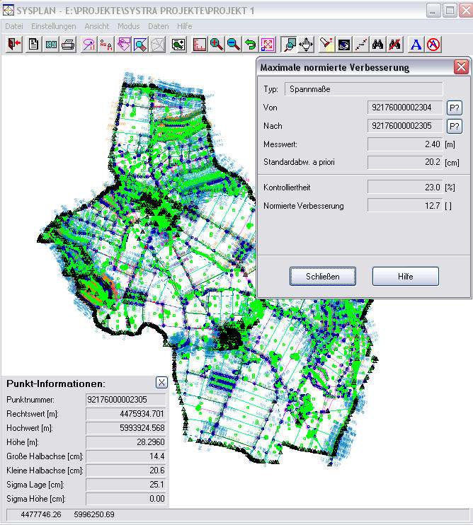Mit Systra können Sie große Mengen geodätischer Messungen und grafische Koordinaten geometrisch verknüpfen, durch Ausgleichungsrechnung nach dem Prinzip der verketteten Transformation in ein gemeinsames Zielkoordinatensystem überführen und objektiv nach ADV-konformen statistischen Verfahren analysieren. Das Ergebnis sind eindeutige und einwandfreie Koordinaten, für welche Qualitätsparameter der Genauigkeit und Zuverlässigkeit nachgewiesen werden.